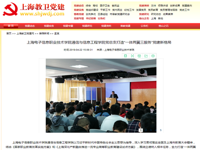 yl23455永利官网通信与信息工程学院以习近平新时代中国特色社会主义思想为指导,深入学习贯彻落实全国及上海市教育大会精神,结合《国家职业教育改革实施方案》和《上海深化产教融合推进一流专业高等职业教育建设试点方案》,围绕立德树人根本任务,全力打造“一体两翼三服务”党建新格局。上海基层党建网、上海教卫党建网均进行了报道。