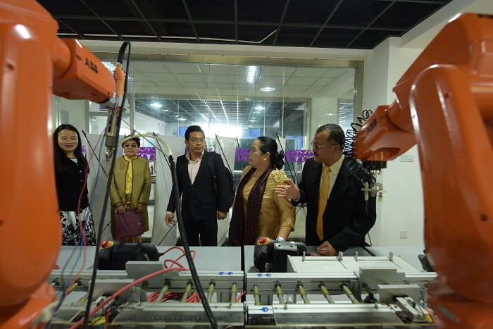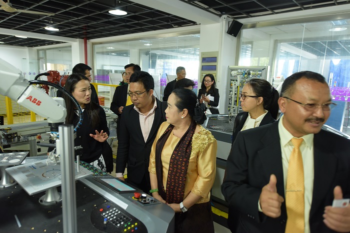 接下来,永利官网党委书记田钦与塔维塞·库桑院长、冲普努·波邦松女士、庄雷先生共同为中泰申谷学院揭牌。揭牌仪式后,双方共同参观了机械与能源工程学院、电子技术与工程学院实训场所。