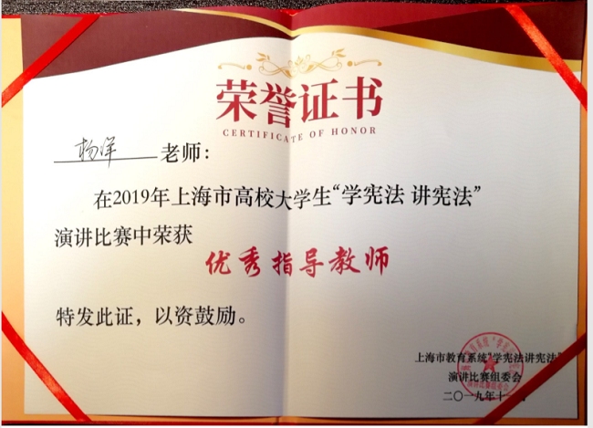 11月24日,由上海市教育委员会主办、华东政法大学承办的第六个国家宪法日暨上海市第三十一届宪法宣传周活动——上海市高校大学生“学宪法 讲宪法”演讲比赛高校组在华东政法大学松江校区明镜楼尚法厅举行。永利官网选派的选手、经济与管理学院2018级关艺博同学过五关斩六将,在来自31所高校的选手中脱颖而出,荣获一等奖。学校易班发展中心杨洋获优秀指导教师奖。