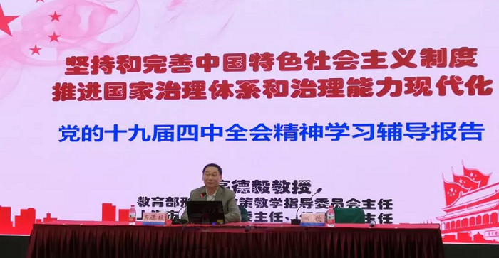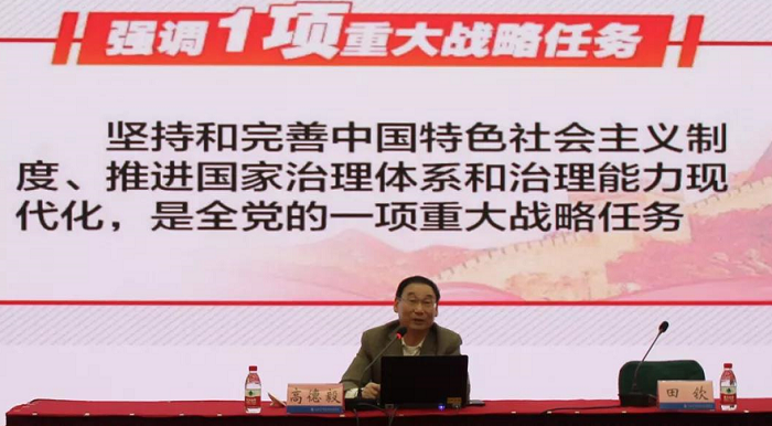 高德毅教授在以《坚持和完善中国特色社会主义制度 推进国家治理体系和治理能力现代化》为题的宣讲中,从全会背景、《决定》总览,坚定中国特色社会主义制度自信,总体要求、总体目标和重大体制机制的战略举措(13个领域)四个方面展开详细解读。他强调,全会提出中国特色社会主义制度是党和人民在长期实践探索中形成的科学制度体系,我国国家治理一切工作和活动都依照中国特色社会主义制度展开,我国国家治理体系和治理能力是中国特色社会主义制度及其执行能力的集中体现。他进一步阐述中国特色社会主义制度和国家治理体系是以马克思主义为指导、植根中国大地、具有深厚中华文化根基、深得中国人民拥护的制度和治理体系,是党和人民长期奋斗、接力探索、历经千辛万苦、付出巨大代价取得的根本成就。他着重从坚定中国特色社会制度自信进行解读,70年来,中国特色社会主义制度和国家治理体系取得丰富的实践成果,党领导人民创造了经济快速发展、社会长期稳定的两大奇迹。