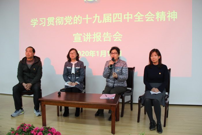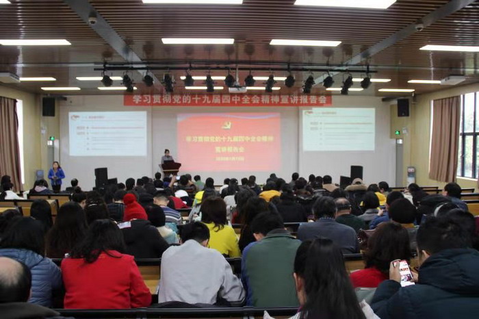1月15日,校党委副书记、校长杨秀英率领的第二宣讲组在闵行校区报告厅举行学习贯彻党的十九届四中全会精神宣讲专题报告会。校党委副书记、校长杨秀英、中德学院党总支书记张峻颖、马克思主义学院直属党支部副书记江龙、电子工程学院院长邵英先后作宣讲报告,中专部和中德工程学院的近140余名教职工出席,报告会由中专部直属党支部副书记张贯彻主持。