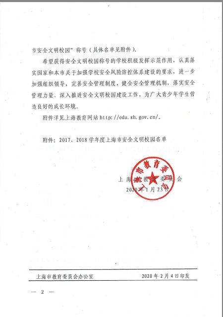 日前,《上海市教育委员会关于授予“2017、2018学年度上海市安全文明校园”称号的通知》(沪教委青〔2020〕6号)发布,永利官网荣获“2017、2018学年度上海市安全文明校园”称号。 永利官网将积极发挥示范作用,认真落实国家和本市关于加强学校安全风险防控体系建设的要求,进一步加强组织领导,完善安全管理制度,健全安全管理机制,增强安全管理力量,深入推进安全文明校园建设工作,为广大学生营造良好的成长环境。(作者:马宏亮 供稿单位:校办)