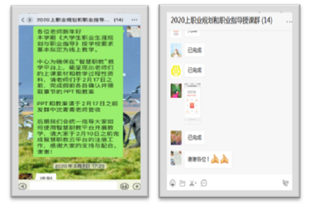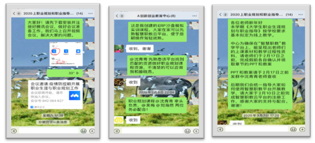 通过“创新创业教育中心”和“职业生涯规划和职业指导”微信群指导、讨论在线教学工作,确保各项工作有序。