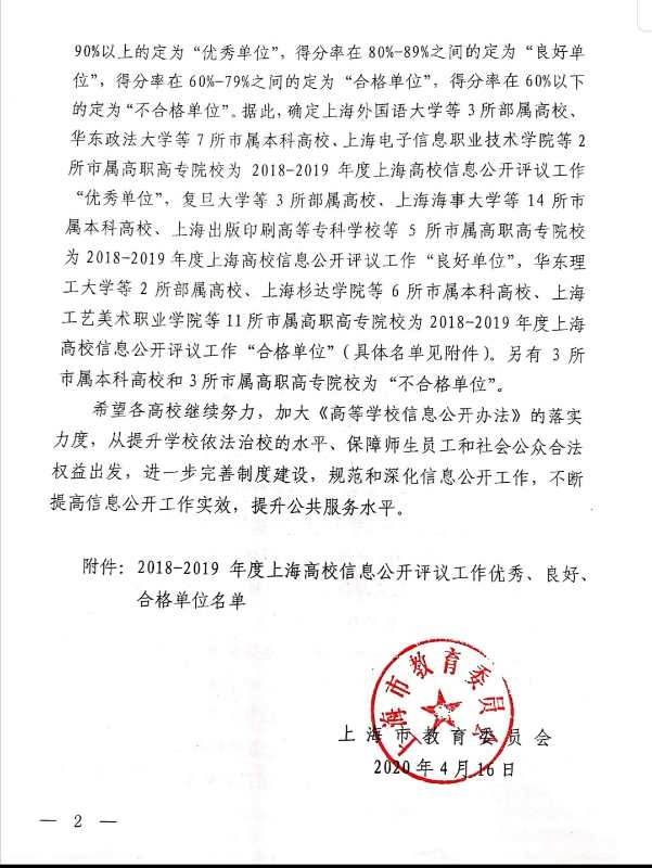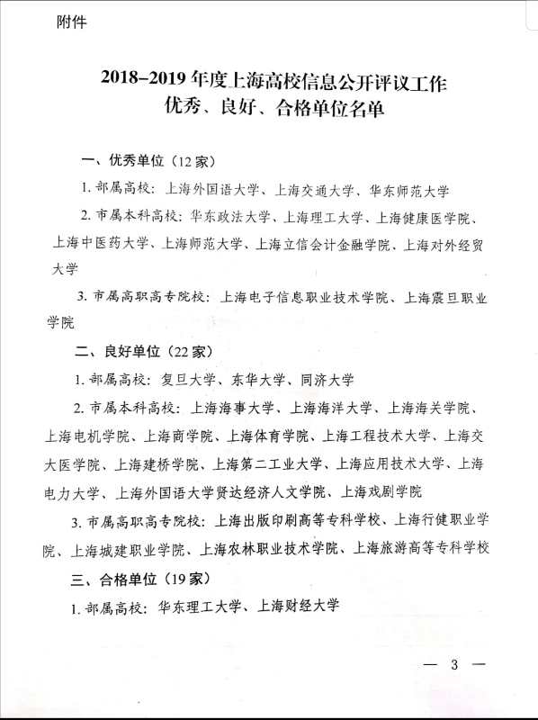 近日,上海市教委发布《上海市教育委员会关于公布2018-2019年度上海高校信息公开评议结果的通知》(沪教委办〔2020〕16号),永利官网获评2018-2019年度上海高校信息公开评议工作优秀单位。 学校将继续加大《高等学校信息公开办法》的落实力度,进一步完善学校制度、规范,深化信息公开工作,不断提高信息公开工作实效,提升依法治校水平,保障师生员工合法权益,提升公共服务水平。(作者:李夏 供稿单位:校办)