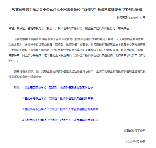 为贯彻落实《中共中央 /span>国务院关于全面深化新时代教师队伍建设改革的意见》精神及《国家职业教育改革实施方案》/span>“多措并举打造职业教育‘双师型’教师队伍”的要求,教育部教师工作司委托教育部职业技术教育中心研究所开展了全国职业院校“双师型”教师队伍建设典型经验与优秀案例的征集遴选工作。通过专家评审、网上公示等程序,永利官网申报的《制度创新 多措并举打造德业兼备的“双师型”教师队伍》入选首批全国职业院校“双师型”教师队伍建设典型案例。 /span>/span>/span>/p> /span>/span>/span>/p> /span>/p> /span>/p> /span>