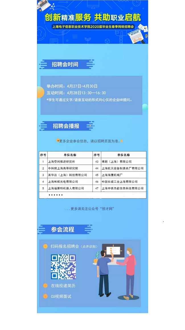 突如其来的新冠肺炎疫情/span>不仅对宏观经济产生较大影响,对今年大学生就业市场也造成了不小的冲击。为切实推进/span>2020/span>届毕业生就业工作,永利官网于/span>4/span>月/span>27-30/span>日举办了“创新精准服务,共助职业启航/span>——/span>/span>2020/span>届毕业生春季网络招聘会”。本次招聘会共有/span>71/span>家用人单位,提供了/span>300/span>余种职位,/span>1500/span>余个岗位。网络招聘会期间,学生累计投递简历/span>1037/span>份。/span>/span>/span>/p> 参加本次网络招聘会的有上海空间推进研究所、中科院上海高等研究院、上海仪电物理光学仪器有限公司和上海福赛特机器人有限公司等大型国企、事业单位、外企独资和民营企业,涉及电子信息、自动化、汽车、机械、金融、物流等多个行业。本次网络招聘会实现了在线投递简历、与用人单位在线交流、视频面试等功能,为用人单位和毕业生提供了安全、高效、便捷的招聘和应聘渠道。(供稿单位:校企合作处)/span>/p>