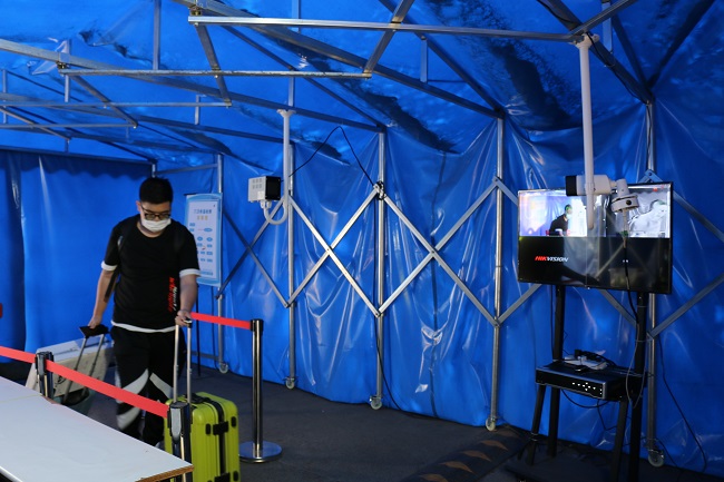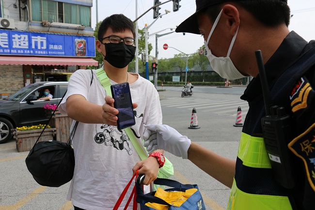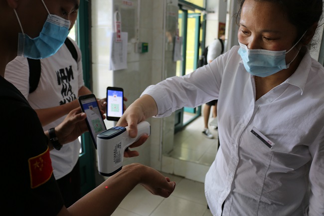 /span> 在校门口,随处可见温馨提示标语、一米间隔线。返校学生在工作人员引导下,积极配合扫描“健康码”、体温检测、身份核验等工作,整个返校过程秩序井然。/span>/p>