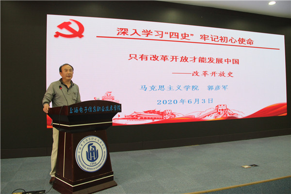 之后,四位宣讲教师分别以《为人民谋幸福为民族谋复兴》《中国人民站起来了》《只有改革开放才能发展中国》《只有社会主义才能救中国》为题,深入简出地讲述党史、新中国史、改革开放史和社会主义发展史。其中,谢国日老师踏着中国共产党历次党代会的足迹,讲述了中国共产党完成的三件大事、探索的三条道路、跨越的两次全局性挫折、作出的四大历史性贡献,让大家认识到中国共产党领导中国人民取得了一个又一个伟大胜利的关键是始终坚持一切为了人民这个根本。王雪玲老师沿着新中国史的重要节点、重要事件脉络,讲述了一个个历史事件背后的故事。从当初一穷二白到如今具有全球最齐全最完备的工业体系,大家更清晰地感受到党坚定带领中国人民当家作主、实现中华民族伟大复兴的坚定信念和决心。郭彦军老师从改革开放的背景、进程、取得的成就以及新时代全面深化改革四个方面阐述了改革开放这一重要法宝的历史逻辑,让大家体会到改革开放这40余年积累的宝贵经验和精神财富。刘学飞老师从社会主义的演变和发展,及中国化的过程告诉我们:“只有社会主义才能救中国。”这不是一句空话,而是一句真理,是无数共产党人血的探索和实践的结果。我们要坚持社会主义道路,在世界高高举起中国特色社会主义伟大旗帜,描绘属于我们的宏伟蓝图。