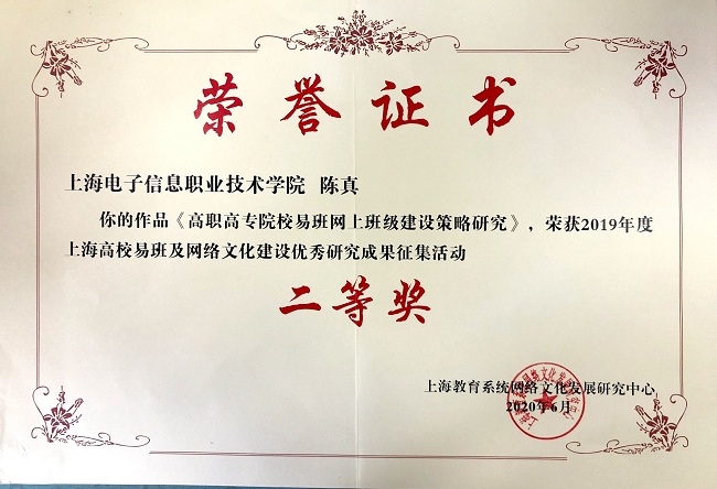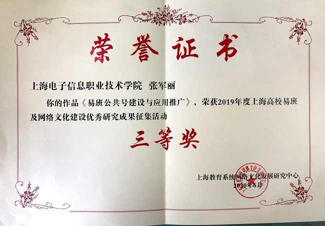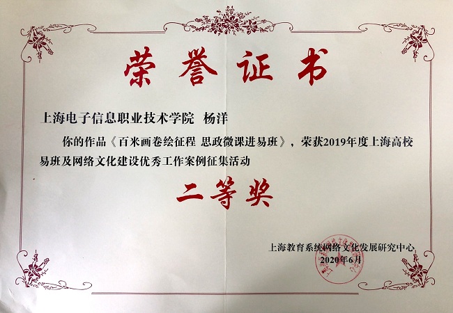 喜报传来!在刚刚结束的2019年上海高校易班及网络文化建设优秀成果征集评选活动中,永利官网易班发展中心主任杨洋的《百米画卷绘征程 思政微课进易班》荣获优秀工作案例二等奖,电子技术与工程学院党总支副书记、副院长陈真的《高职高专院校易班网上班级建设策略研究》、电子技术与工程学院张军丽老师的《易班公共号建设与应用推广》分获优秀研究成果二等奖、三等奖。