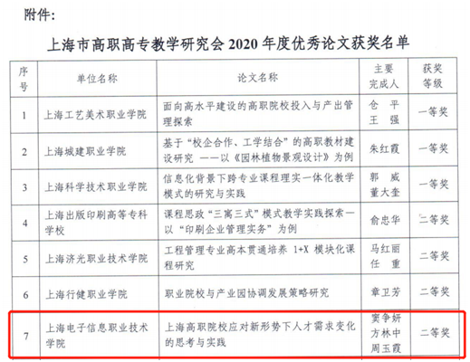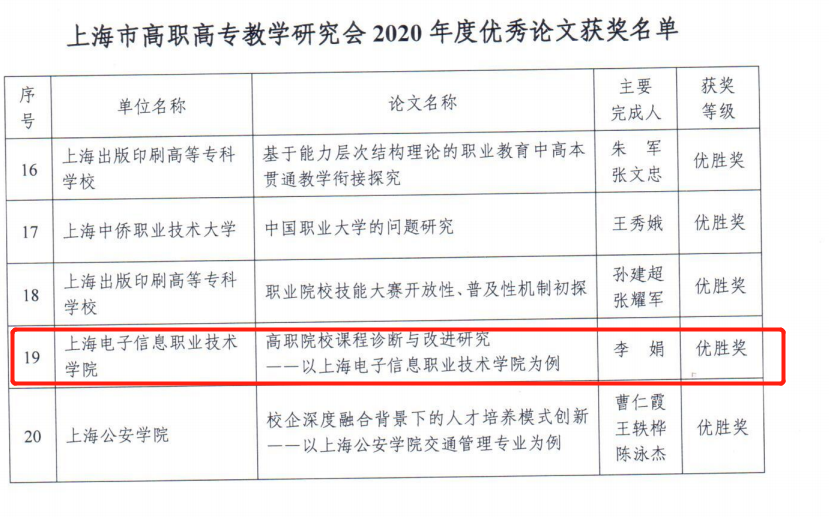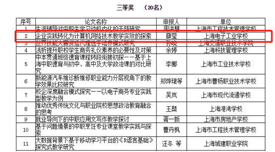另外,在上海市职业教育协会公布的第十五届优秀论文评选结果中,永利官网薛莹老师完成的论文《企业实践转化为计算机网络技术教学实效的探索》获得三等奖。(供稿单位:科研处)/span>/span>/p>