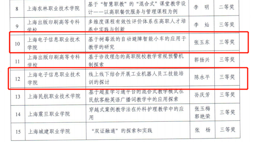 近日,上海市职业教育协会高职高专教学工作专业委员会、上海市高职高专教学研究会公布/span>2020/span>年度优秀论文评选结果/span>/span>。/span>永利官网窦争妍、方林中、周玉霞老师共同完成的论文《上海高职院校应对新形势下人才需求变化的思考与实践》获得二等奖;张玉东老师完成的论文《基于树莓派的自动避障智能小车》、陈永平老师完成的论文《线上线下结合开展工业机器人员工技能培训的探讨》获得三等奖;李娟老师完成的论文《高职院校课程诊断与改进研究——以电子信息职业技术学院为例》获得优胜奖。 /span>/p>