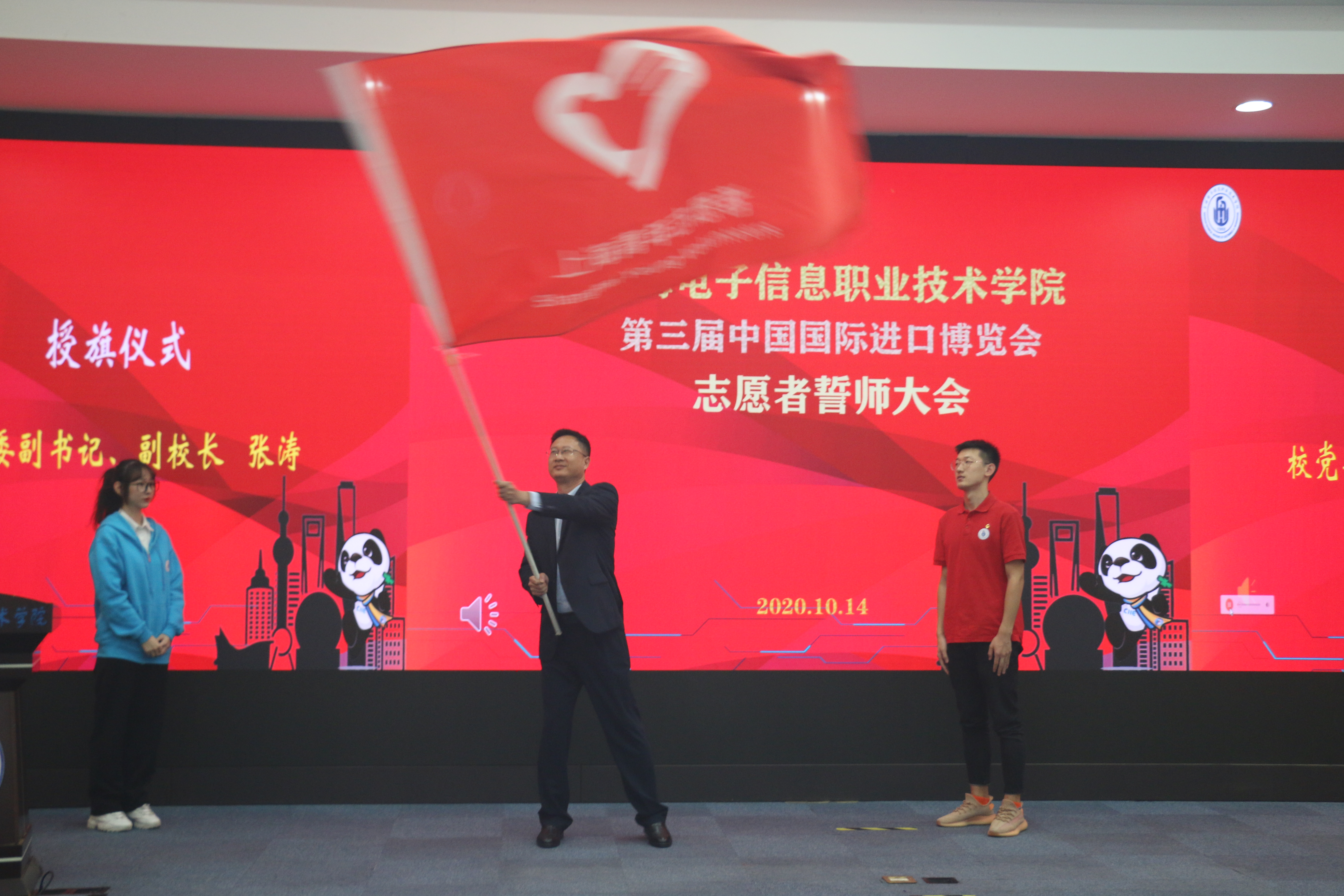 随后,校党委副书记、副校长张涛为本届进博会志愿服务队授旗。全体志愿者在校团委滕崧老师的带领下,进行了庄重的志愿者宣誓。/span>