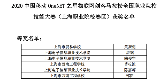 同时,本次赛事还是2020年上海市第二届“四大品牌”职业技能大赛OneNET 物联网智慧城市赛项的初赛。经过比拼,产生了进入决赛的24名选手的名单,选手们将于2020年11月18日参加该赛项的决赛。(供稿单位:通信与信息工程学院)