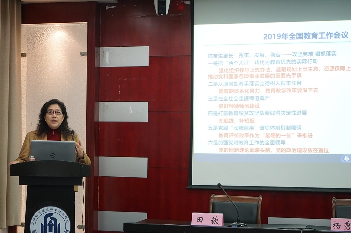 /span> 学校党委副书记、校长杨秀英与大家沟通了2019年行政工作设想。杨校长首先介绍了2019年全国教育工作会议内容,为学校2019年工作定下基调。随后,她从坚持立德树人根本,提升师队建设质量;深化教育教学改革,完善质量保障体系;渗透创新创业教育,深化国际合作内涵;提升科研技术水平,增强社会服务能力;坚持依法依规办学,创新校企合作机制;提升管理服务水平,建设美丽和谐校园等方面,对学校2019年行政工作作出安排。她指出要切实推动学校内涵发展,围绕学院“十三五”事业发展规划,持续深化综合改革,优化质量保障,推进依法治校,创新运行机制,完善内控管理,全面推动学校人才培养事业发展。