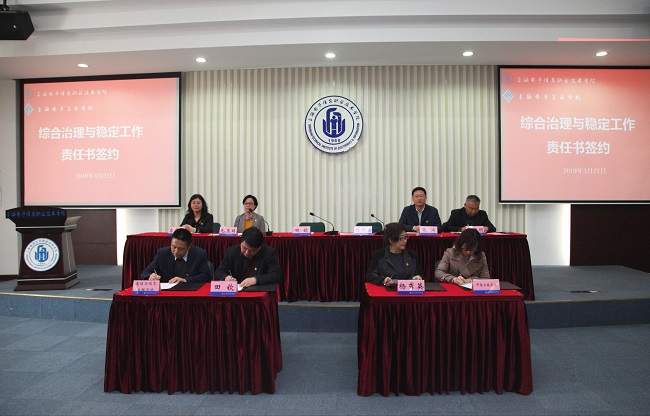 会上,党委书记田钦、党委副书记、校长杨秀英分别与党总支、党群工作部门、二级学院、职能部门代表签订了综合治理与稳定工作责任书和全面从严治党工作责任书。