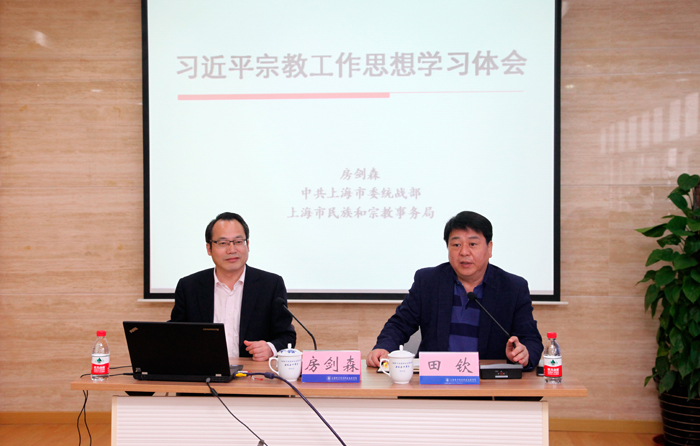 2019年5月13日,学校召开党委理论学习中心组(扩大)学习会,邀请上海市委统战部副部长、市民宗委党组书记房剑森主讲党和国家民族宗教政策。学校党政领导、纪委委员、教学单位党政负责人、职能部门负责人、各二级学院分管学生工作副书记、学管办主任、部分辅导员参加学习。学校党委书记田钦主持学习会。