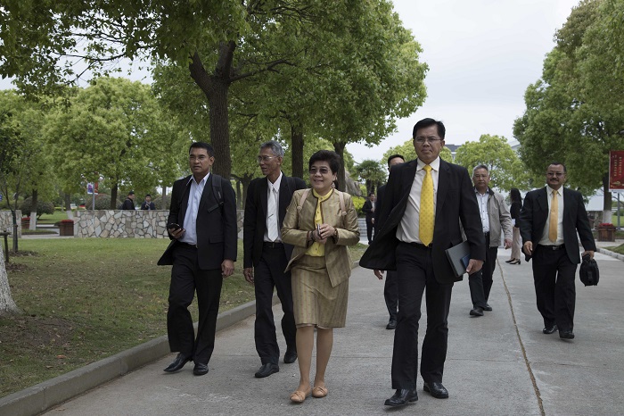 初夏的yl23455永利官网生机勃勃,绿意盎然。5月14日下午,学校迎来远道而来的泰国政府总理办公室特别顾问本松·禅颇博迪先生、曼谷职业教育中心主任冲普努·波邦松女士一行。永利官网党政领导和相关部门负责人前往迎接。亲切问候之后,双方赴图书馆一楼大厅参加中泰申谷学院揭牌仪式。