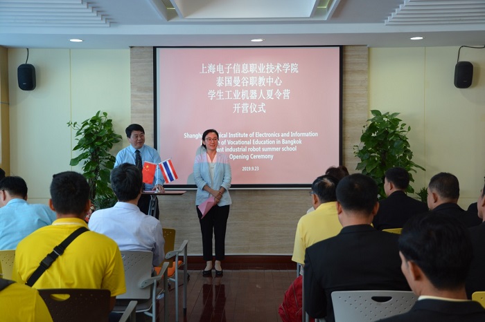 学校党委书记田钦致辞,欢迎泰国师生来永利官网参加工业机器人夏令营活动和师资培训。田书记介绍,永利官网是“国家示范性高等职业院校建设计划”骨干高职院校、上海市示范性高等职业技术院校,具有一支业务能力精湛、教学水平高超的师资队伍,拥有国家和上海市示范性实训基地,同时也属于全国第一批开设工业机器人技术专业的院校。田书记表示,基于永利官网与泰国曼谷职教中心的友好合作以及2018年成功开展的首届学生工业机器人训练营,双方促成了此次工业机器人夏令营活动和泰国学生来华留学项目。相信泰国曼谷职教中心职业院校的师生通过夏令营活动和师资培训项目一定会有所收获,他们与永利官网师生相互交流,共同提高,并预祝这次泰国学生工业机器人夏令营圆满成功。