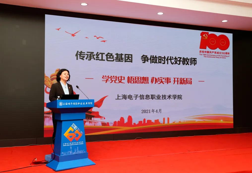 窦争妍副校长的宣讲报告《传承红色基因,争做时代好教师》主要分成三个主题板块:一是铭记光辉历史。通过梳理中国近代百年历史风云,结合上海城市发展历史,清晰指明中国共产党为国家、为人民、为民族、为世界作出了彪炳史册的伟大贡献,实现了中华民族从“东亚病夫”到站起来、富起来、强起来的伟大历史飞跃。二是传承红色基因。中国共产党人天然具有以“革命理想高于天的坚定信念”“永远听党话跟党走的无限忠诚”“独立自主探索创新的思想品质”“全心全意为人民服务的根本宗旨”为代表的时代精神和“红色基因”,这是保障红色事业永续发展的精神源泉和不竭动力。在宣讲中,她分享了很多鲜活生动的红色故事,让听众更加深刻领悟到什么是初心使命,如何坚定理想信念,从容展现“四个自信”。三是争做时代好老师。窦副校长结合学校办学实践,强调指出新时代“四有”好老师的标准、使命和要求,倡导用身边人身边事感召全体教师认识自我、重塑自我、做更好的自己,立德树人,培根铸魂,不忘初心,牢记使命,为社会培养和输送更多高素质技能技术型人才,为学校发展和社会进步贡献自身力量。