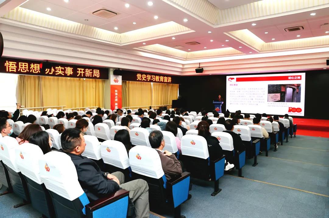毛玉婷副书记的宣讲报告《初心之地 复兴之路 信仰之光》从三个方面展开:一是勘掘史料,钩沉史实,从理论基础、阶级基础、干部基础三个方面阐析上海为什么可以成为中国共产党的初心之地。上海是中国工人阶级的摇篮,也是近代以来中国与世界联通的重要窗口。第一批由海路赴法勤工俭学的学生就是从上海出发的,而这些旅法学生孕育了中国革命的领导骨干,为中国共产党领导下的革命和建设事业最终取得伟大胜利奠定了扎实基础。二是文图互阐、图文并茂,以时间为经、史实为纬详尽展示中国共产党百年“复兴之路”。通过集中梳理“第一个五年计划”到“第十三个五年计划”的发展历程,以时间的演进展现我党取得的举世瞩目的成就。中国共产党领导和带领全国各族人民用几十年时间走完了发达国家几百年走过的历程,走向了中华民族复兴之路。三是饱含深情,热切推介,追溯和缅怀百年党史中闪耀“信仰之光”的革命烈士、建设楷模、改革先锋和民族脊梁的光辉事迹。从1921年党的成立至1949年新中国成立,无数烈士英名永远镌刻在民族崛起和复兴的丰碑上。在建设和改革年代,无数英模人物舍小家为大家,用鲜血和汗水为社会主义现代化建设添砖加瓦、鞠躬尽瘁,他们身上闪耀着“理想信念”之光,与日月同辉。中国共产党人的信仰之火一经点燃,从未熄灭过。