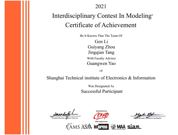 4月23日夜间,2021年美国大学生数学建模竞赛成绩公布。由通信与信息工程学院李根、唐菁倩以及中德工程学院周贵阳组成的永利官网代表队不畏强手,克服种种困难,最终成功获得三等奖。