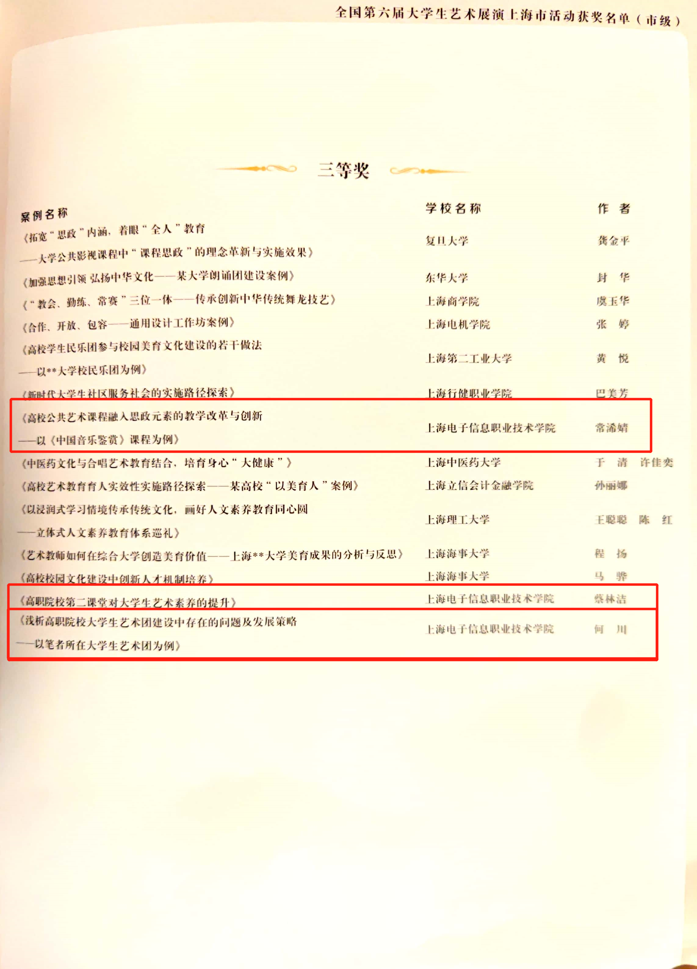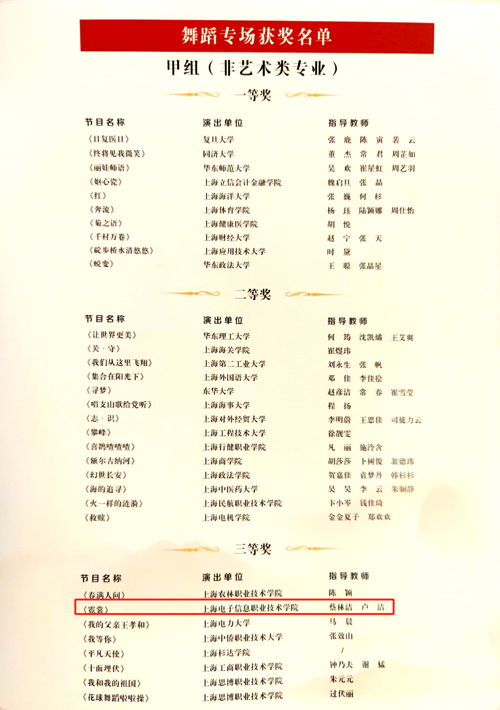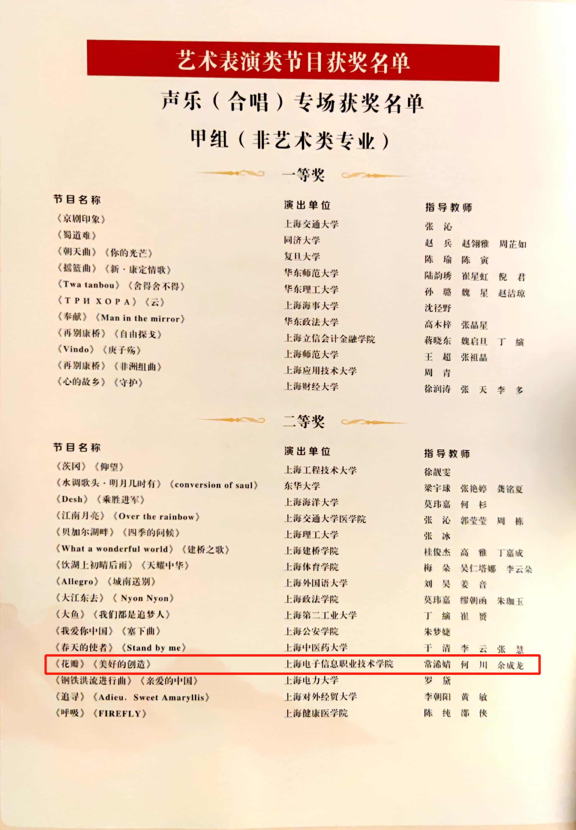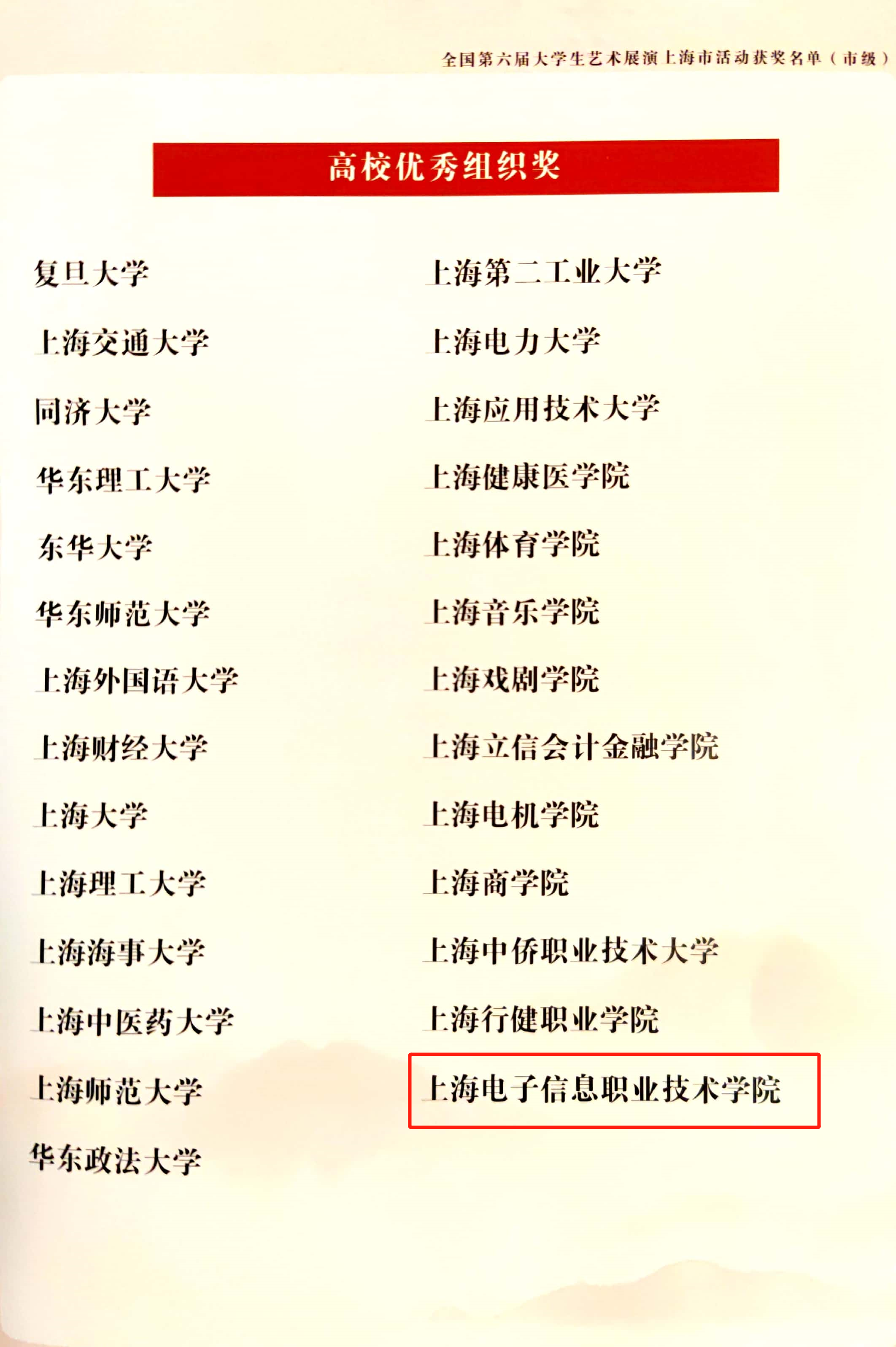 近日,上海市教育委员会公布了第六届全国大学生艺术展演上海赛区活动获奖名单。永利官网共荣获11个奖项,在上海高职院校中名列前茅。其中,获得高校优秀组织奖1个、“校长风采奖”1个、其他艺术表演及设计类二等奖2个、三等奖7个。