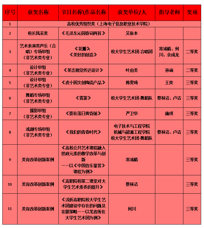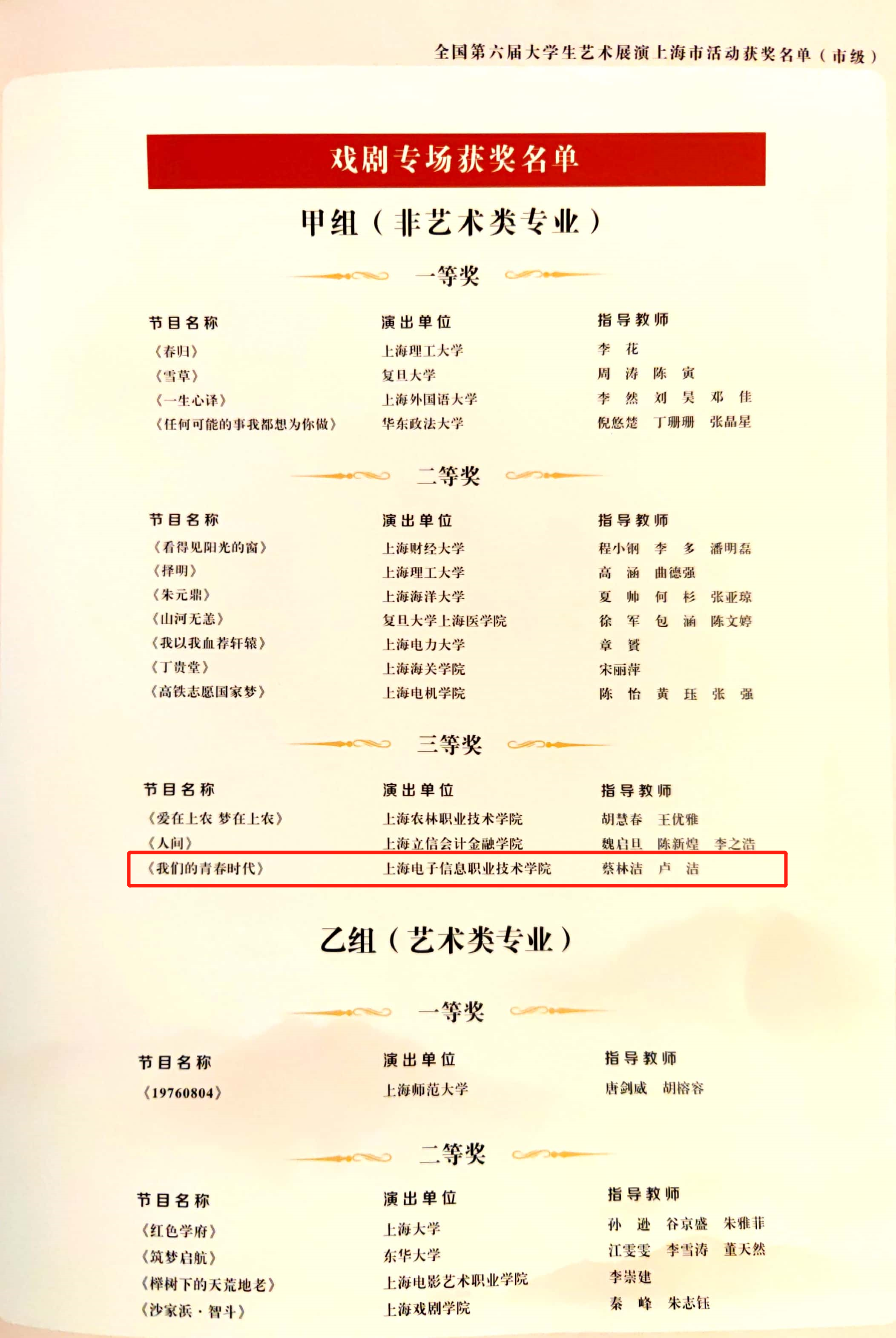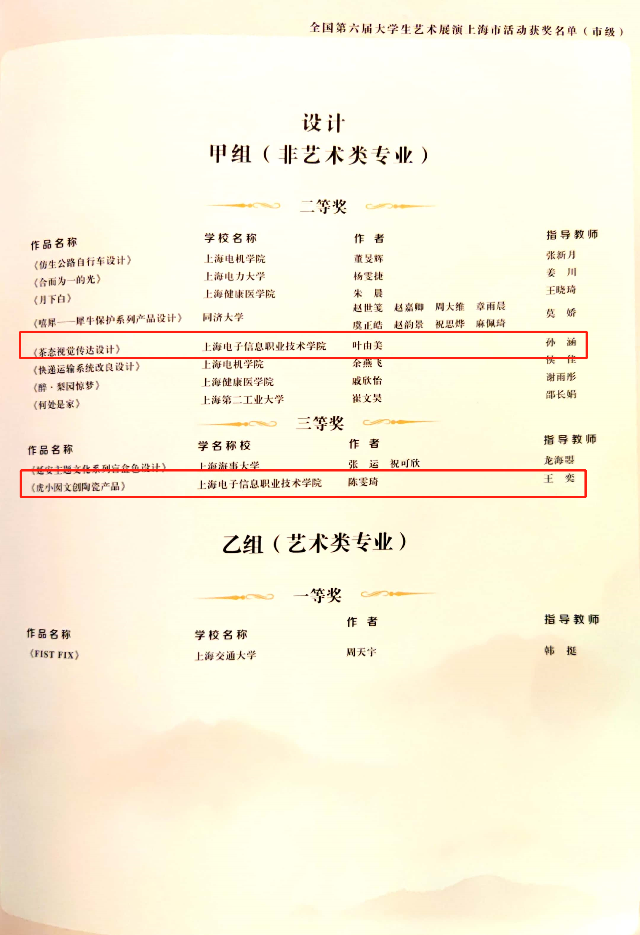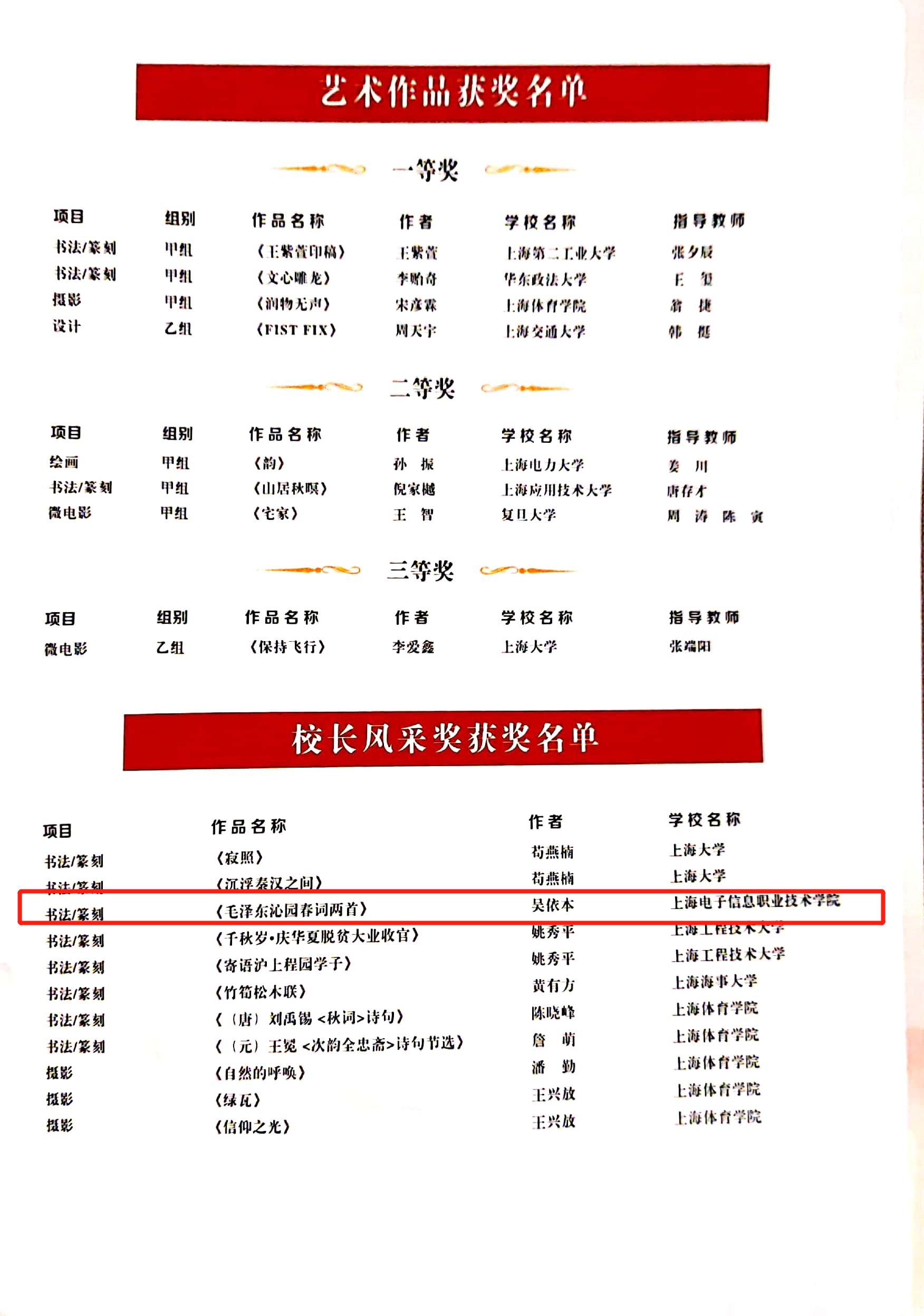 近日,上海市教育委员会公布了第六届全国大学生艺术展演上海赛区活动获奖名单。永利官网共荣获11个奖项,在上海高职院校中名列前茅。其中,获得高校优秀组织奖1个、“校长风采奖”1个、其他艺术表演及设计类二等奖2个、三等奖7个。