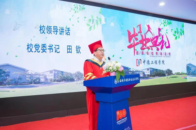 建党百年初心不移,中德学子扬帆起航。7月2日下午,中德工程学院2021届学生毕业典礼在学校C108报告厅隆重举行。学校党委书记田钦、德国汉斯•赛德尔基金会上海代表处首席代表、中德合作项目负责人施泰德,党委副书记、副校长张涛、学工部副部长栾文飞、教务处副处长王西贝、中德工程学院党政负责人、全体教师及2021届学生出席毕业典礼。