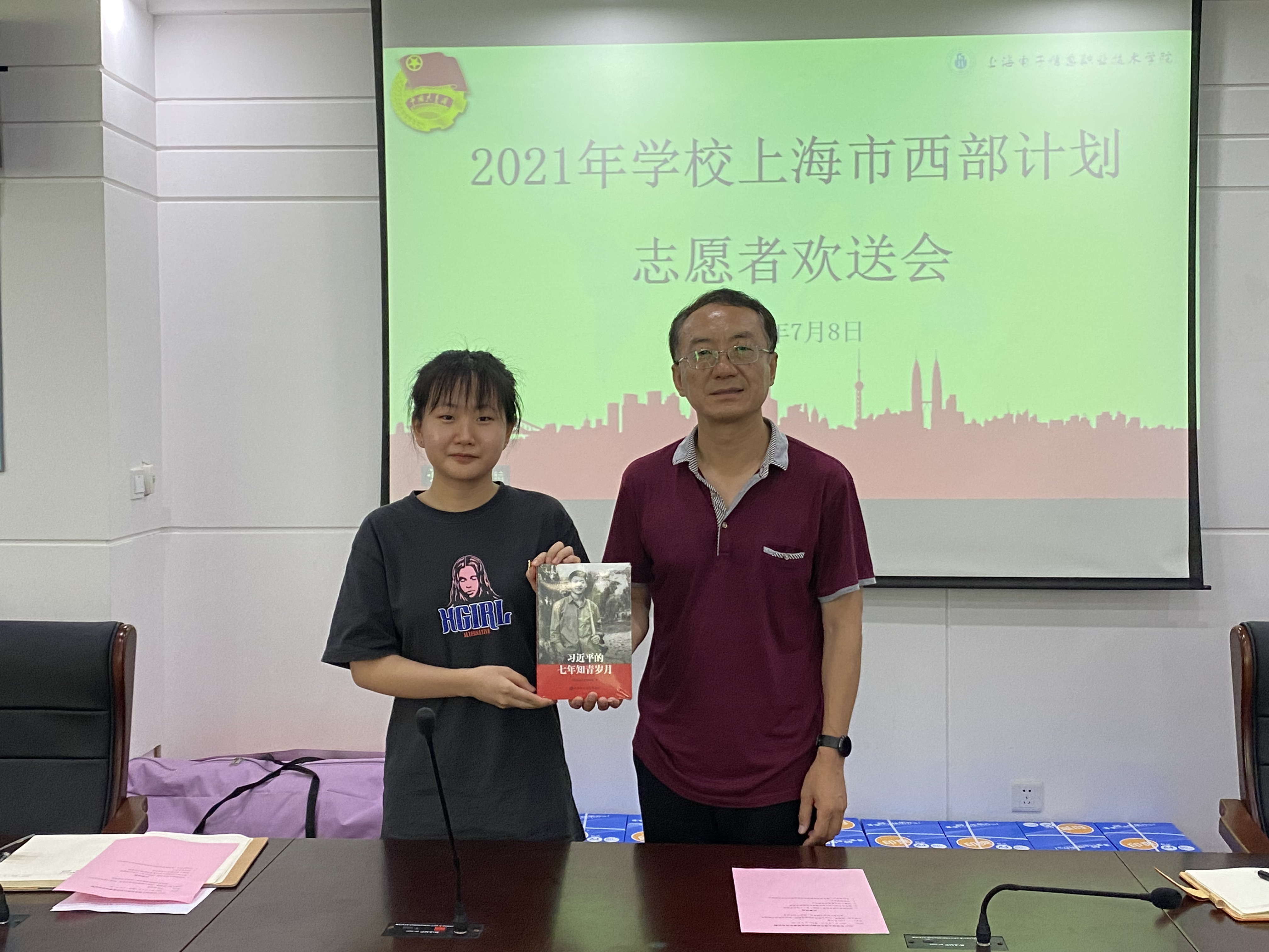 张涛副书记和经济与管理学院党总支书记蔡军林代表学校向庄怡雯同学赠送了《习近平的七年知青岁月》一书和为其精心准备的志愿者慰问品,并嘱咐庄怡雯同学要不忘初心,牢记使命,胸怀理想信念,践行奉献精神,启航西部新征程,为第二个“一百年奋斗目标”贡献自己的青春力量。