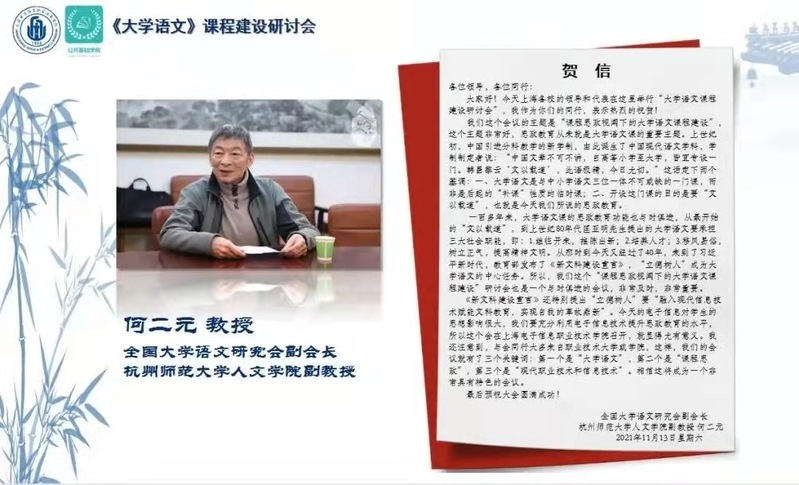 国内知名学者、全国大学语文研究会副会长何二元副教授特发贺信。《贺信》讲到,思政教育从来就是大学语文课的重要主题,举办“课程思政视阈下的大学语文课程建设”研讨会非常及时,非常重要。同时,“立德树人”要“融入现代信息技术赋能文科教育,实现自我的革故鼎新”,要充分利用电子信息技术提升思政教育工作水平。他认为,研讨会紧扣“大学语文”“课程思政”“现代职业技术和信息技术”三大关键词,在yl23455永利官网举办,得天时地利人和,是一个非常具有特色的会议。