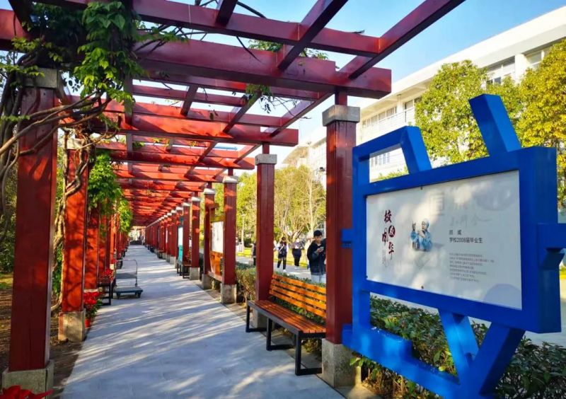 “工匠校史”主题文化长廊在原自然景观紫藤长廊基础上所建,位于校园的东南侧,西起图书馆,南临浦南运河,东接毕业林,北与爱心小木屋隔道相望,全长200米。这里是学生晨跑、教室和宿舍之间往来的主要途经之地。“工匠校史”主题文化长廊项目由宣传部、基建后保处共同参与建设。
