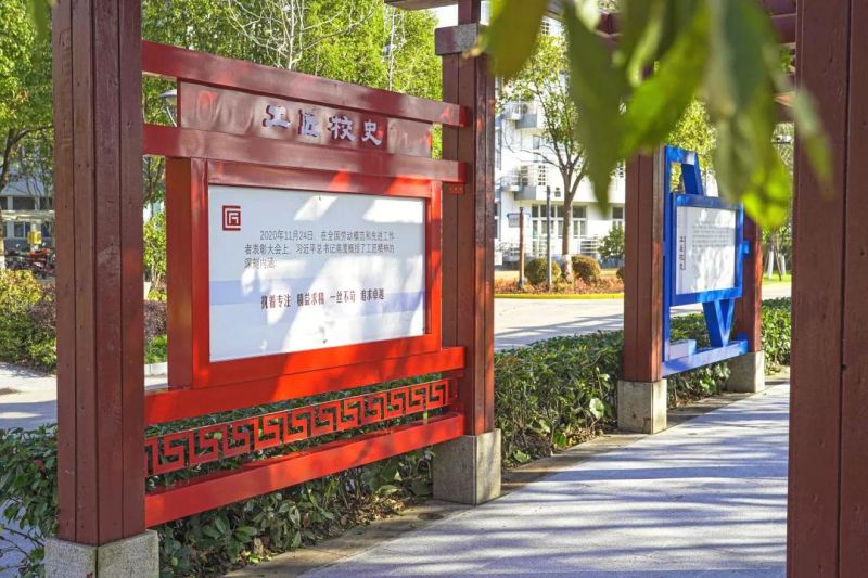 在紫藤长廊走道上,我们把学校“七迁校址、七易其名”的时间轴、工匠文化的主要节点及学校校训做成不锈钢板镶嵌其中,意寓让师生沿着学校工匠历史的足迹不断前行。整个文化长廊的设计和施工,得到了设计艺术学院肖俊凯老师的指导和把关。