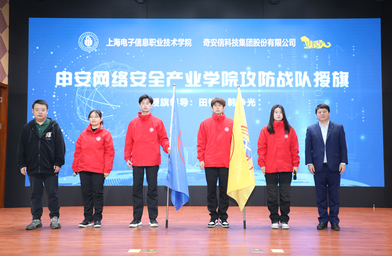 党委书记田钦与奇安信集团副总裁韩争光共同为申安网络安全产业学院攻防战队授旗。攻防战队队员们发出响亮誓言:“守护网络安全、修身兼安天下、争做网安精兵、为建设安全上海奉献青春力量!”
