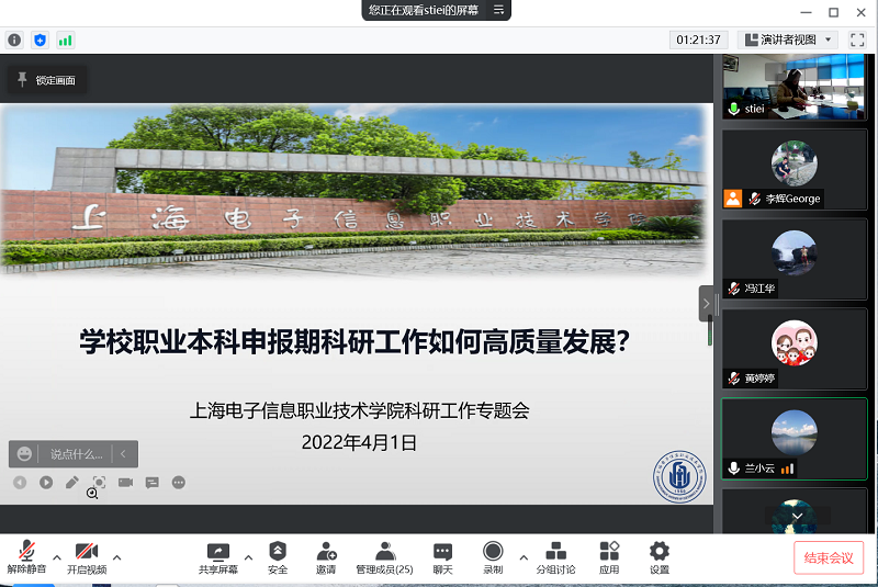 田钦书记从职业本科建设需要、高质量技术技能人才培养需要、产教融合校企合作需要、高水平双师型教师队伍建设需要和国际影响力打造需要这五个方面阐述了科研高质量发展对学校整体发展的重要意义。他指出,要充分认识到科研工作的重要性,要充满信心、创新突破,积聚力量、加强组织,形成高质量发展的科研氛围和长效机制,营造良好科研环境,实现学校科研跨越式发展;要充分运用好学校学科专业的优势和特点,实现与技术革新及产业进步的同步发展,为国家及上海经济社会发展做出积极贡献。