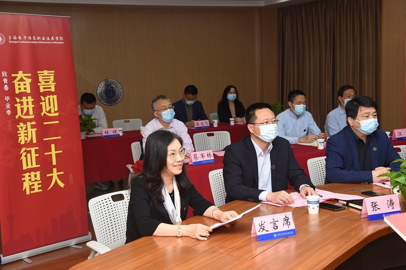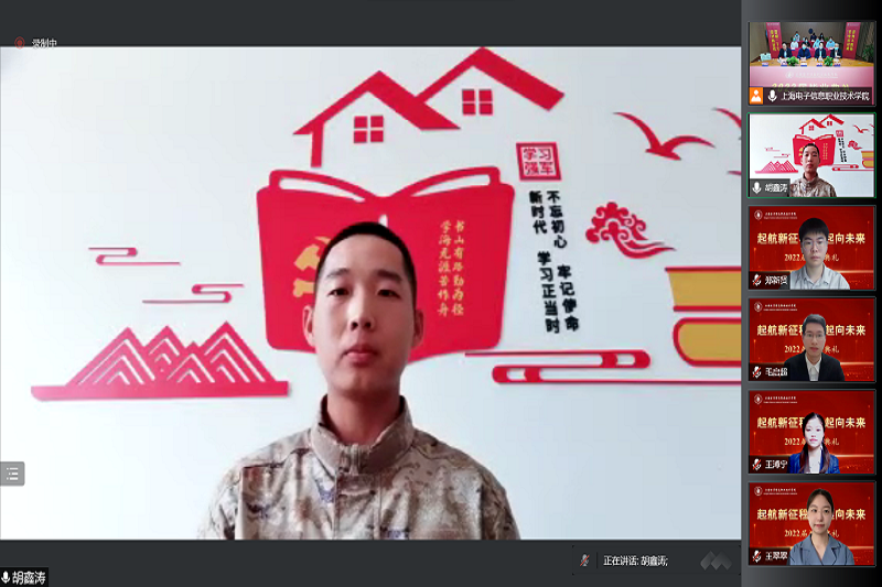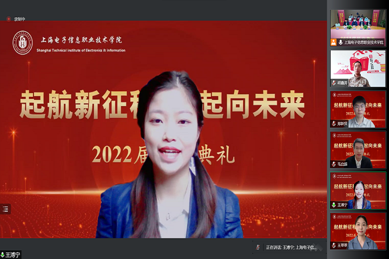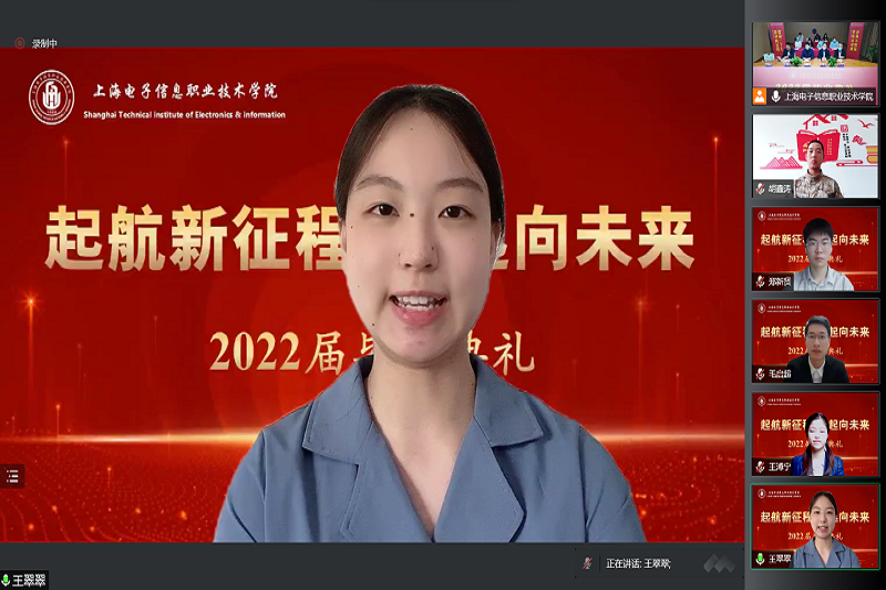 通过云端连线的方式,学校与目前就职于特斯拉(上海)有限公司的毛启超,学校第一届高职扩招优秀毕业生王翠翠,高本贯通班、毕业后继续攻读学士学位的王溥宁,在毕业季选择投身军营、保家卫国的胡鑫涛等四位毕业生,送上母校对毕业生们的关怀和祝贺。毕业生代表录制视频《一路有爱·感恩有你》,展现出毕业生们对全体教师三年来的谆谆教诲、对后勤工作人员无尽付出、对同窗好友温暖相伴最真诚的感谢。