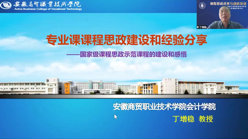 国家级课程思政教学名师丁增稳教授以《专业课程思政建设和经验分享》为主题,向大家介绍了安徽商贸职业技术学院课程思政建设的成功经验,并围绕《纳税实务》这门课程,详细介绍了实施课程思政的具体做法,强调要通过课程思政实现知识传授、能力培养和价值引领的有机统一。