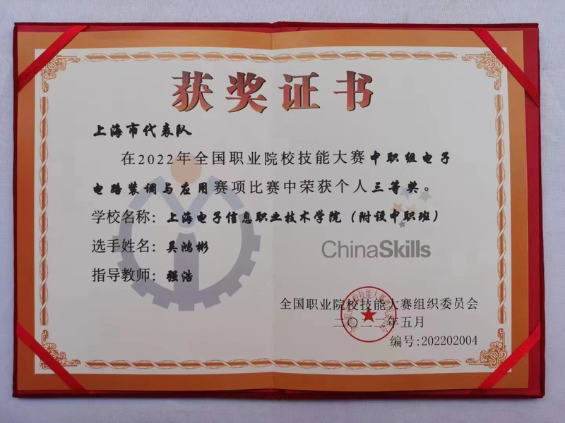 8月4日—5日,2022年全国职业院校技能大赛(中职组)“电子电路装调与应用”赛项在青海省西宁市青海交通职业技术学院举行,共有来自全国各省(自治区、直辖市)的64支代表队参赛。yl23455永利官网194应电2班吴鸿彬同学作为该赛项上海参赛选手之一,他奋勇拼搏、追求卓越,最终取得了大赛三等奖的好成绩。