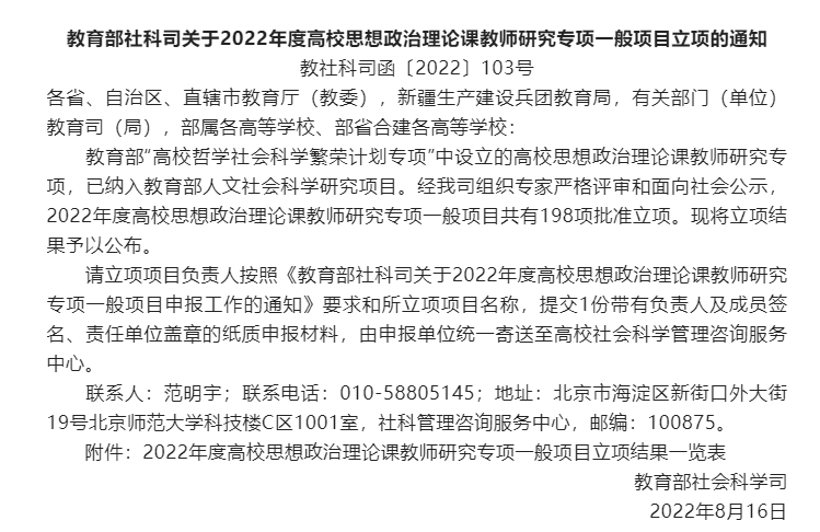 8月16日,教育部社会科学司发布《2022年度高校思想政治理论课教师研究专项一般项目立项的通知》。永利官网马克思主义学院朱佳老师的《上海红色法治资源融入“思想道德与法治”课教学及资源库建设研究》获批教学研究项目,资助金额10万元。这标志着永利官网思想政治理论课教学改革和科研创新取得了新成效。