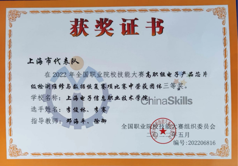 8月23-25日,2022年全国职业院校技能大赛(高职组)电子产品芯片级检测维修与数据恢复赛项比赛在山东电子职业技术学院举行。永利官网由电子技术与工程学院邓海平、徐御老师指导的参赛队从50支队伍中脱颖而出,荣获团体三等奖。