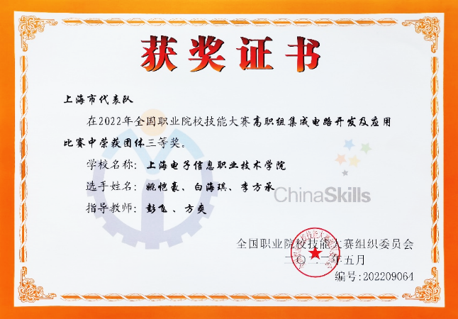 8月30日至31日,2022年全国职业院校技能大赛(高职组)“集成电路开发及应用赛项”在山东省滨州职业技术学院圆满落幕。2020级集成电路技术专业学生白海琪、李方承和2020级微电子技术专业学生姚凯豪在电子技术与工程学院教师李军锋(领队),彭飞、方爽(指导教师)的指导下代表上海队参加比赛,经过2天10个小时的激烈角逐,团队荣获全国三等奖。