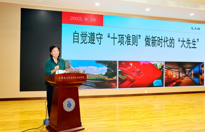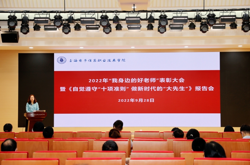 9月28日,学校在奉贤校区C108召开2022年“我身边的好老师”表彰大会暨《自觉遵守“十项准则” 做新时代的“大先生”》报告会。学校党委书记田钦,党委副书记、纪委书记毛玉婷、宣传部部长张贯彻、各二级学院书记、教学副院长、教师代表等出席本次会议。教师工作部部长、人事处处长张峻颖主持会议。