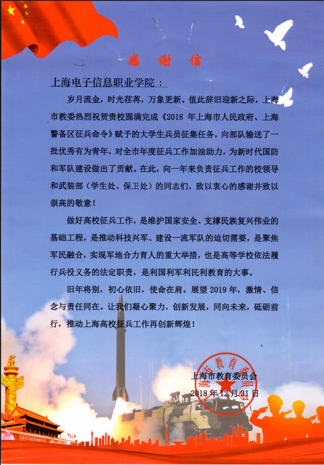 近日,上海市教育委员会发来感谢信,对学校圆满完成《2018年上海市人民政府、上海警备区征兵命令》赋予的大学生兵员征集任务表示热烈祝贺。感谢信指出,上海市教委热烈祝贺学校圆满完成《2018年上海市人民政府、...
