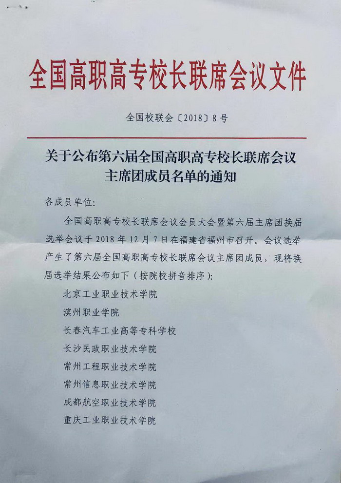永利官网入选第六届全国高职高专校长联席会议主席团成员单位