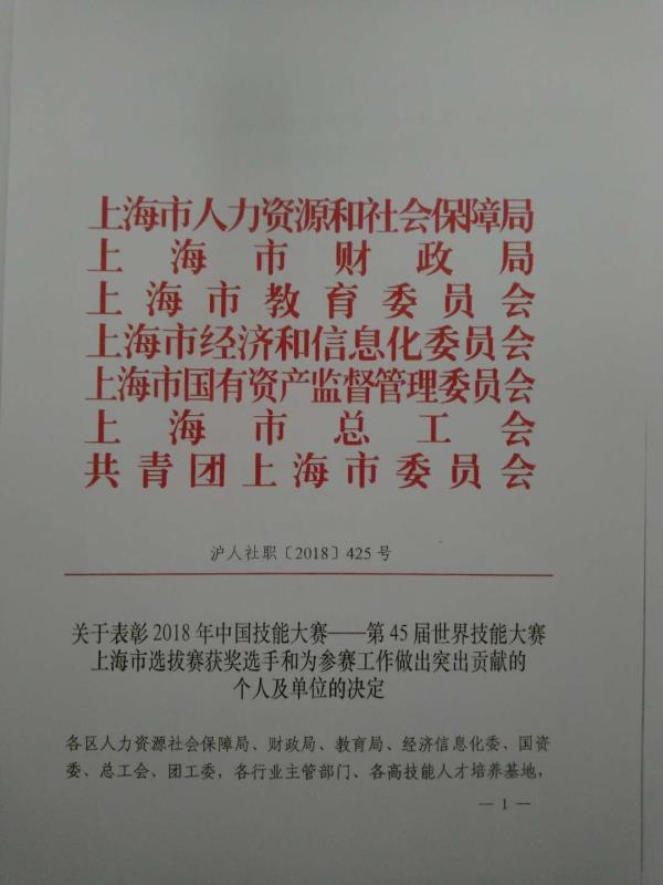 2018年12月24日,市人力资源社会保障局、市财政局、市教委、市经济信息化委、市国资委、市总工会、团市委对2018年中国技能大赛第45届世界技能大赛上海市选拔赛获奖选手和为参赛工作做出突出贡献的个人及单位予以...