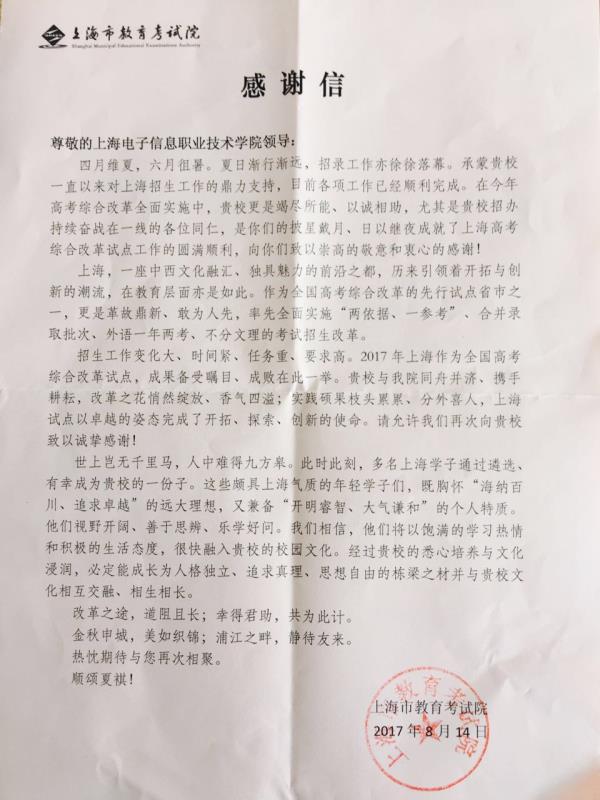 上海市教育考试院来信感谢永利官网对招生工作的支持