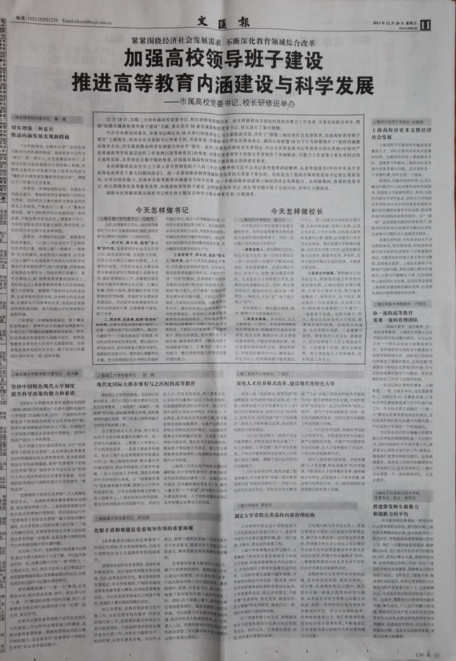2013年12月20日出版的《文汇报》在第十一版以“加强高校领导班子建设 推进高等教育内涵建设”为标题,刊登了我院党委书记、院长杨秀英在市属高校党委书记、校长研修班上的主题发言“搭建激发师生凝聚力和创新力...