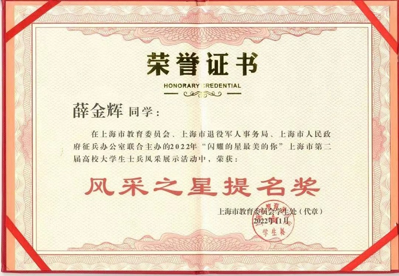 喜报 | 永利官网学生荣获上海市第二届大学生士兵 “风采之星提名” 奖