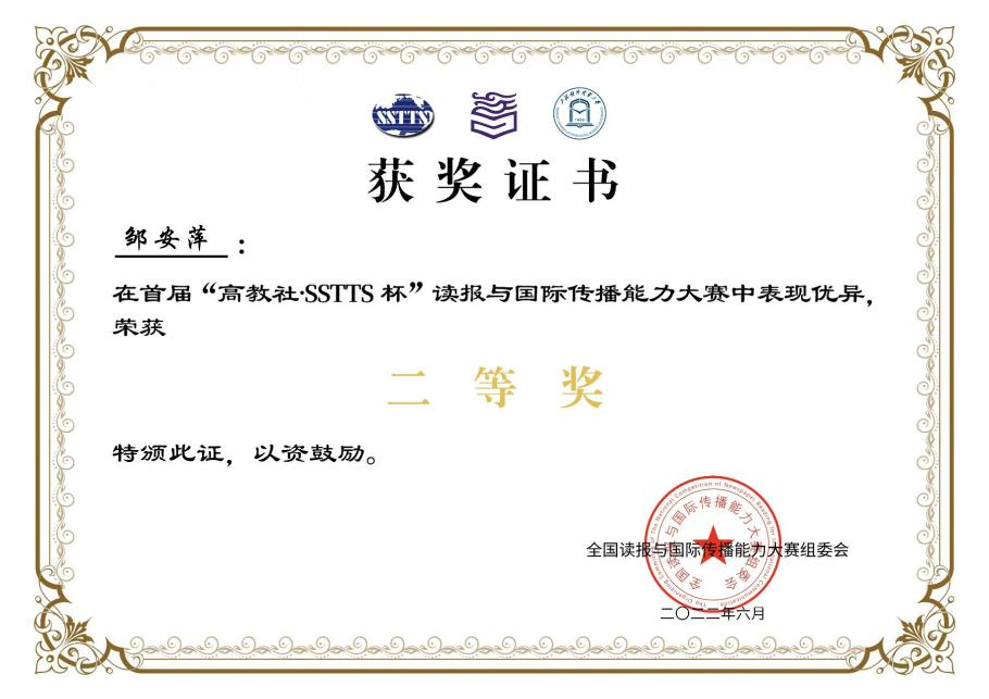 日前,首届“高教社·SSTTS杯”全国读报与国际传播能力大赛获奖名单揭晓。永利官网2021级应用英语专业学生邹安萍获决赛二等奖,徐晓莉获优秀指导教师奖。 该赛事由高等教育出版社和上海市科技翻译学会主办,...