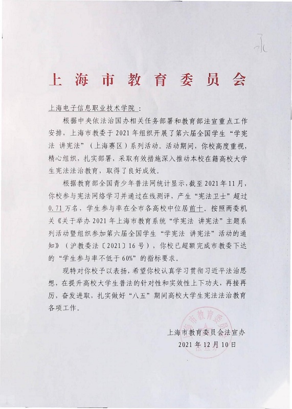 近日,上海市教育委员会法宣办发来表扬信,对永利官网采取有效措施深入推动在籍学生宪法法治教育工作予以表扬。 来信指出,根据教育部全国青少年普法网统计显示,截至2021年11月,永利官网参与宪法网络学习并通过在线...